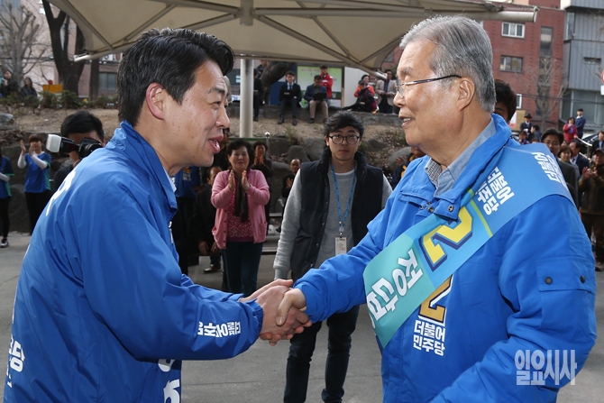 4.13 총선 공식선거운동 개시일인 31일 오후 서울 서대문구 홍제천에서 김영호 더불어민주당 후보와 김후보의 지원유세를 나온 김종인 더불어민주당 비대위 대표가 악수를 하고 있다.