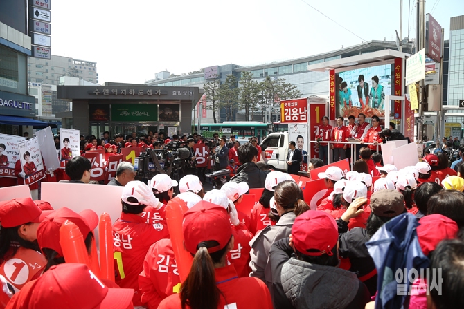 1일 오전 경기도 수원역 로데오거리 입구에서 열린 수원지역 후보자 합동 유세에서 지원유세에 나선 김무성 새누리당 대표가 수원 유권자들에게 지지를 호소하고 있다.