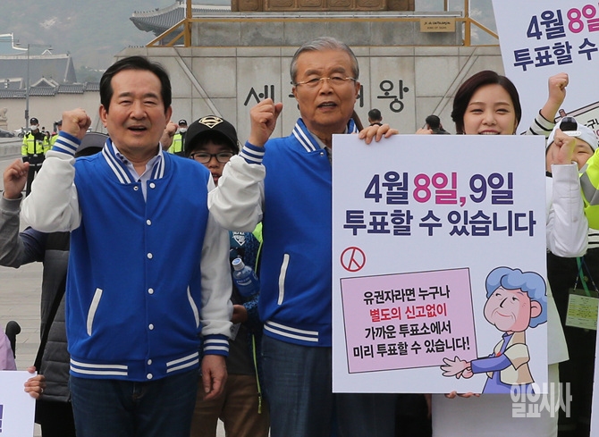 6일, 서울 중구 광화문 세종대왕상 앞에서 김종인 더불어민주당 선대위원장과 정세균 후보가 20대총선 사전 투표 독려 캠페인을 벌이고 있다.