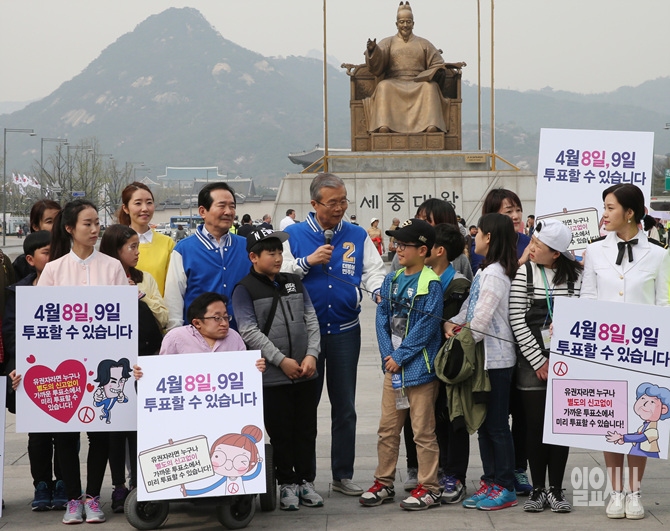 6일, 서울 중구 광화문 세종대왕상 앞에서 김종인 더불어민주당 선대위원장과 정세균 후보가 20대총선 사전 투표 독려 캠페인을 벌이고 있다.