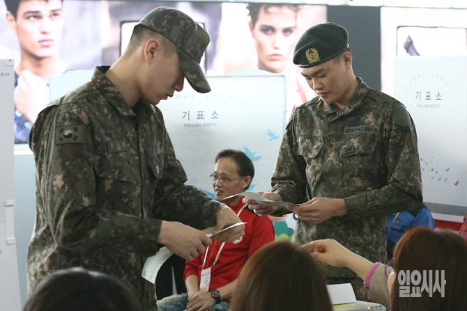 제20대 국회의원선거 사전투표 시작일인 8일 오전 서울역에 설치된 사전투표소를 찾은 군인들이 투표용지를 수령하고 있다.