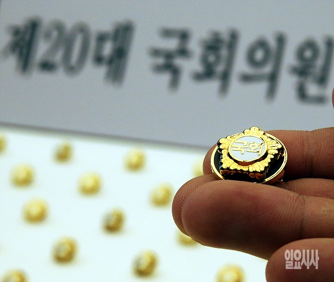 4·13총선을 이틀 앞둔 11일, 서울 여의도 국회 의원식당에서 20대 국회의원 배지가 언론에 공개되고 있다.