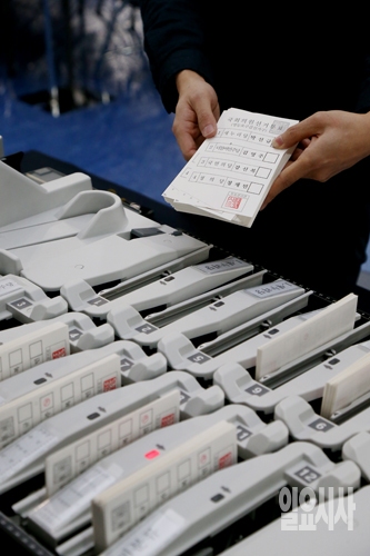4.13 총선이 하루 앞으로 다가온 가운데 12일 오후 서울 영등포구 여의도고등학교에 설치된 개표소에서 선관위 관계자들이 개표소 설비를 점검하며 투표지분류기를 시험운영하고 있다.
