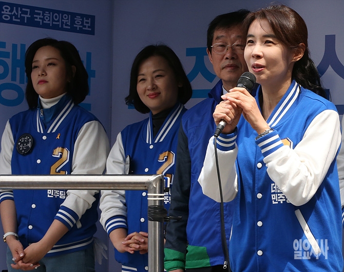 총선을 하루 앞둔 12일, 김종인 더불어민주당 비대위 대표가 서울 용산구 후암시장 앞에서 열린 진영 후보 지원유세에 참석한 가운데, 비례대표 1번을 받은 박경미 후보가 지지를 호소하고 있다.