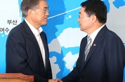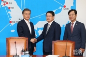새정치민주연합 문재인 대표(왼쪽)와 백승주 국방부 차관이 21일 오전 국회 대표회의실에서 북한의 휴전선 부근 포격관련 보고에 앞서 악수하고 있다. 일요시사=구윤성 기자(kysplanet@ilyosisa.co.kr)
