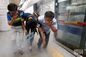 19일 오후 서울 동작구 사당역에서 '제399차 민방위의 날 민방공 대피 훈련'의 일환으로 진행된 독가스·화재·테러 대비 훈련에서 구조대원들이 독가스에 중독된 시민들을 구조하고 있다. 일요시사=구윤성 기자(kysplanet@ilyosisa.co.kr)