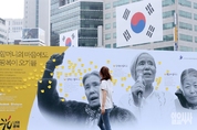 12일 서울광장에 세워진 위안부 할머니들을 기리는 아트월(Art wall)에 한 시민이 응원의 글을 남기고 있다. 고(故) 김학순·황금주·강덕경 할머니 세 분의 사진과 생전에 남긴 말씀을 담은 아트월은 서울시가 위안부 할머니들의 마음에도 광복이 오기를 기원하는 마음으로 전시했다. 일요시사=구윤성 기자(kysplanet@ilyoisa.co.kr)