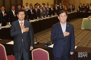 최경환 경제부총리 겸 기획재정부 장관(오른쪽)이 6일 오후 서울 중구 명동 은행회관에서 열린 제48차 세제발전심의위원회에 참석해 국기에 대한 경례를 하고 있다. 일요시사=구윤성 기자(kysplanet@ilyosisa.co.kr)
