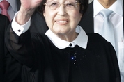 고 김대중 전 대통령의 부인 이희호 김대중평화센터 이사장이 5일 오전 서울 강서구 방화동 김포국제공항에서 인사를 하고 있다. 이 여사는 이날 저가항공사인 이스타항공편으로 서해 직항로를 통해 평양에 도착, 3박4일간의 일정을 소화한다.