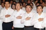 25일 충남 천안시 우정공무원교육원에서 열린 '2015 새누리당 국회의원 연찬회'에서 김무성 대표와 원유철 원내대표를 비롯한 의원들이 국기에 대한 경례를 하고 있다. 일요시사=구윤성 기자(kysplanet@ilyosisa.co.kr)