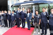 이재명 경기도지사 및 주요 참석자들이 4일 오전 경기도 성남시 판교제2테크노밸리 기업지원허브에서 열린 경기도 자율주행차 '제로셔틀' 시승행사에서 제로셔틀 앞에서 기념촬영을 갖고 있다.