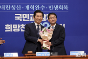 더불어민주당 정청래 대표가 12일 서울 여의도 국회에서 열린 최고위원회의에서 강득구 신임 원내대표에게 꽃다발을 전달하고 있다. 이날 정 대표는 최고위원회의에 앞서 한 원내대표와 강득구·문정복·이성윤 신임 최고위원에게 꽃다발을 전달했다. 앞서 더불어민주당은 지난 11일 원대대표·최고위원 보궐선거를 통해 한병도 신임 원내대표와 강득구·문정복·이성윤 최고위원을 선출했다. 일요시사=고성준 기자(joonko1@ilyosisa.co.kr) <joonko1@ilyosisa.co.kr>