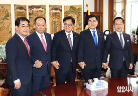 [포토] 김경수 단식농성장 찾은 이재명-김부겸-이광재-박용진
