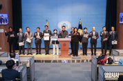 더불어민주당 문화예술특별위원회 소속 의원들이 11일 오후 서울 여의도 국회 소통관에서 열린 '서울시 종묘 일대 재개발 철회 촉구'기자회견에서 구호를 외치고 있다. 이날 문화예술위는 “오세훈 서울시장이 서울시의회의 문화재 보호 조례 개정을 근거로 종묘의 가치를 훼손하는 재개발을 추진하고 있다”며 “서울시장의 임기는 4년이지만, 종묘는 400년 뒤에도 대한민국의 상징으로 존재할 유산”이라고 강조하며 서울시에 재개발 결정 철회를 촉구했다. 일요시사=천재율 기자(1000jae@ilyosisa.co.kr) <1000jae@ilyosisa.co.kr>