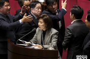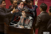 국민의힘 나경원 의원이 9일 서울 여의도 국회에서 열린 제429회국회(정기회) 제16차 본회의에서 '가맹사업거래의 공정화에 관한 법률 일부개정법률안이 상정되자 필리버스터(무제한토론)을 하고 있다. 우원식 국회의장이 "가맹사업법과 관련된 발언을 해야한다"고 나 의원에게 주의를 줬지만 멈추지 않자, 여야 의원들이 발언대로 나와 거친 언성으로 서로에게 항의하고 있다. 일요시사=고성준 기자(joonko1@ilyosisa.co.kr) <joonko1@ilyosisa.co.kr>